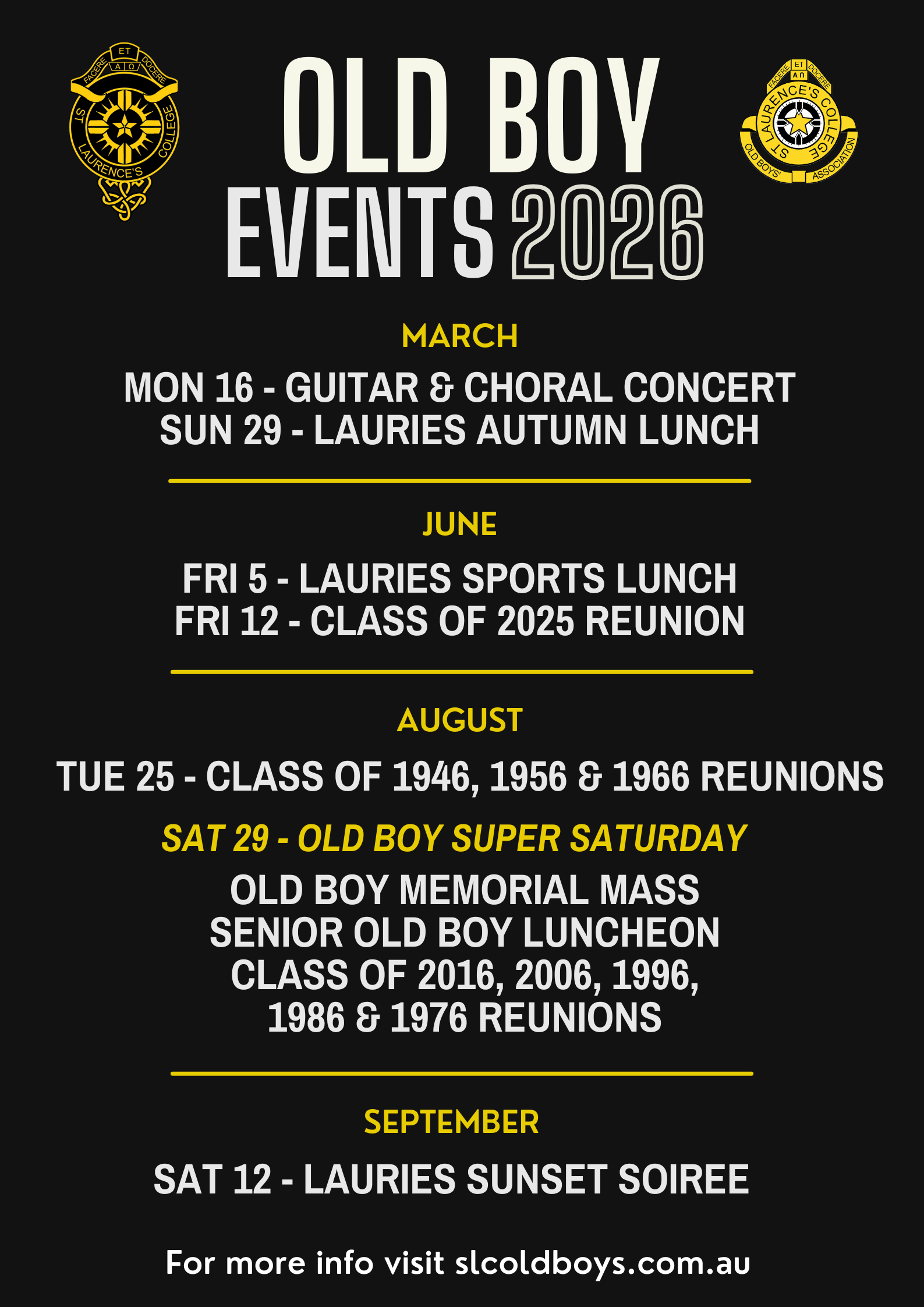 In 2026, there is an array of exciting events on for Old Boys, including the consolidation of the Old Boys' Weekend into a Super Saturday. The Old Boys' Memorial Mass and Senior Old Boys' Luncheon will now be held on Saturday 29 August accompanied by the milestone reunions for the year including 10, 20, 30, 40 and 50 Year Events.