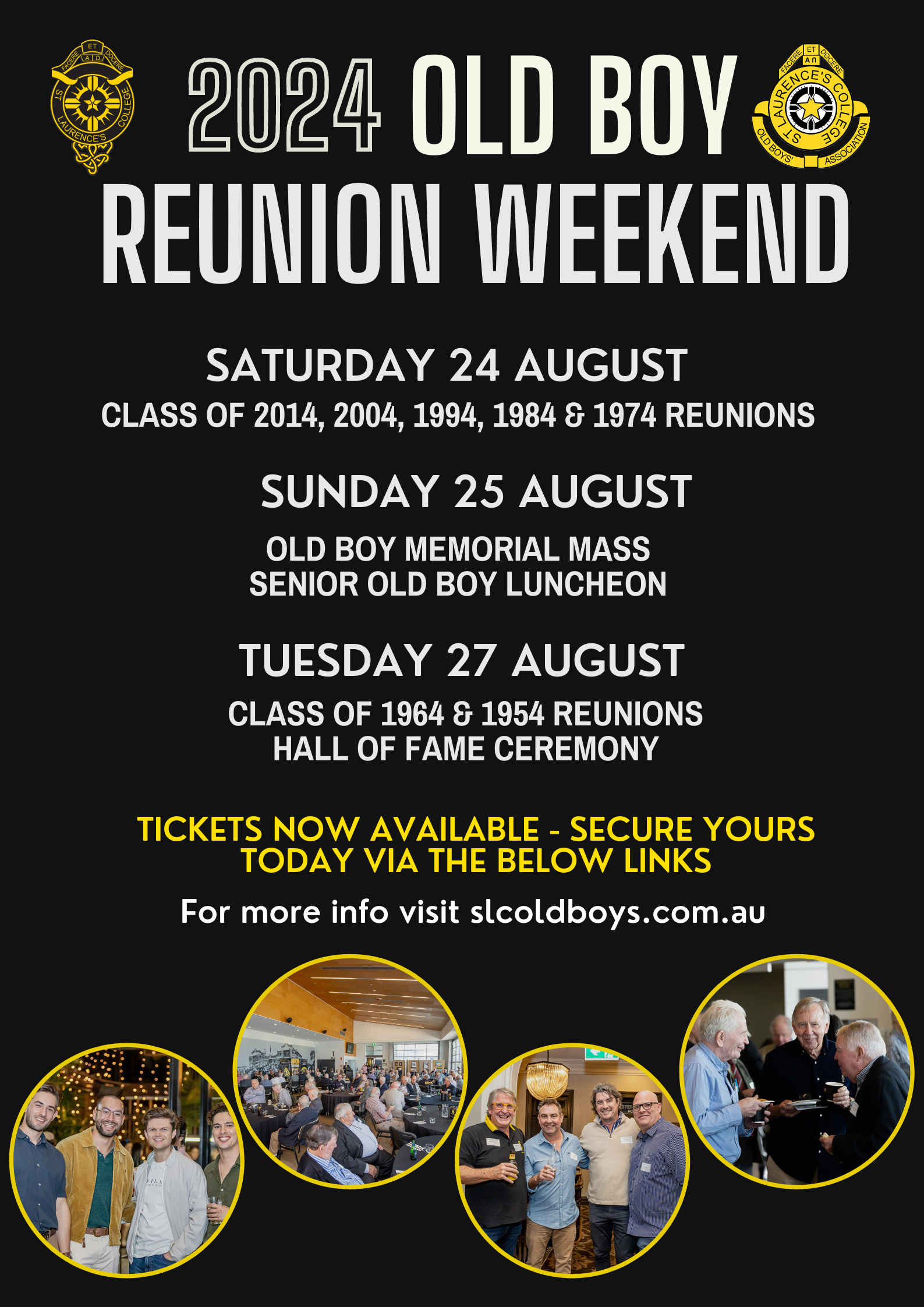 Just a reminder, the Reunion Weekend is on again in August. As Chris Leadbetter once said, it is the longest weekend in history. If you have not already registered for your reunion (10-20-30-40-50-60) please do so ASAP. It also includes the traditional Seniors Lunch, Memorial Mass and Old Boys Assembly with the College (Hall of Fame/ Young Alumni of the Year and Woody Cup Presentations). There is so much to look forward to over 5 days.